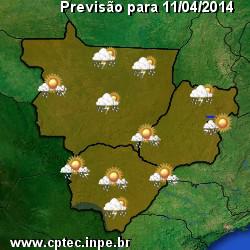 11/04/2014: Em todas as áreas da região: muitas nuvens e pancadas de chuva localizadas a qualquer hora. Em alguns pontos as pancadas de chuva serão fortes. Temperatura estável. Temperatura máxima: 34ºC no nordeste de MT. Temperatura mínima: 18ºC no leste de GO.