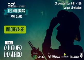Estão abertas as inscrições para mais uma edição do Encontro de Tecnologias para o Agro. Realizado pelo Sindicato Rural de Campo Grande (SRCG), o evento acontecerá pela manhã do dia 5 de abril, as inscrições são gratuitas pelo site www.srcg.com. br.
